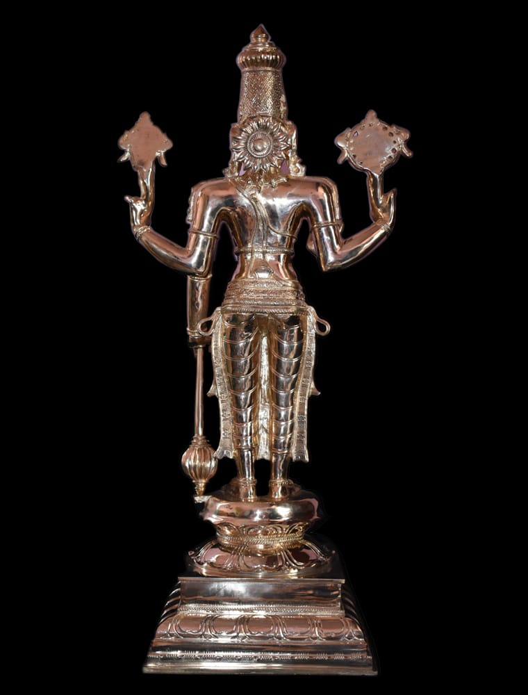 • Here he holds a chakra (war discus) in his upper right hand and a shankha (conch battle trumpet) in his upper left.